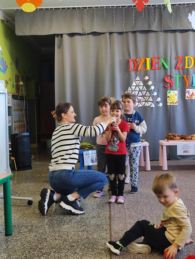 Maluchy z zainteresowaniem wysłuchały pogadanki przeprowadzonej przez panią dietetyk Katarzynę Majcher - Łebko, podczas której mogły wykazać się wiedzą na temat zdrowego i rozsądnego podejścia do żywności.