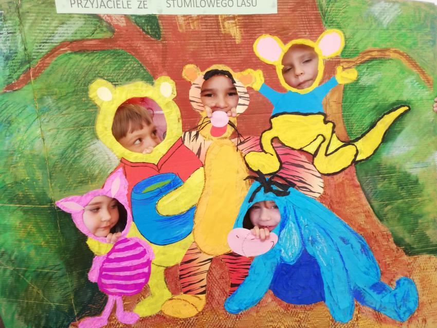 Dzieci z grupy  IV p. Małgorzaty Grabias i p. Jolanty Bryła 25 listopada obchodziły Dzień Pluszowego Misia. Poznały historię powstania pluszowych zabawek. Z zainteresowaniem słuchały czytanej historii pt: „Przygody Misia Lubisia”, którą wraz z rodzicami napisała i zilustrowała Julka (praca konkursowa zadanie nr.1 z konkursu organizowanego w przedszkolu „ Mój przyjaciel i ja”).Na korytarzu naszego przedszkola  podziwialiśmy wyeksponowane prace konkursowe dzieci w tym z naszej grupy: Tymoteusza, Ignacego, Zuzi, Rozalki i i Julki. Przedszkolaki wcielając się w role postaci z bajek wykonały sobie pamiątkowe zdjęcia w fotobudce „ Przyjaciele ze Stumilowego lasu”. Dużo  radości sprawiły zabawy  przy muzyce podczas której  dzieci prezentowały swoje bajkowe stroje. Słodki poczęstunek  był miłym akcentem dnia. /M.G./