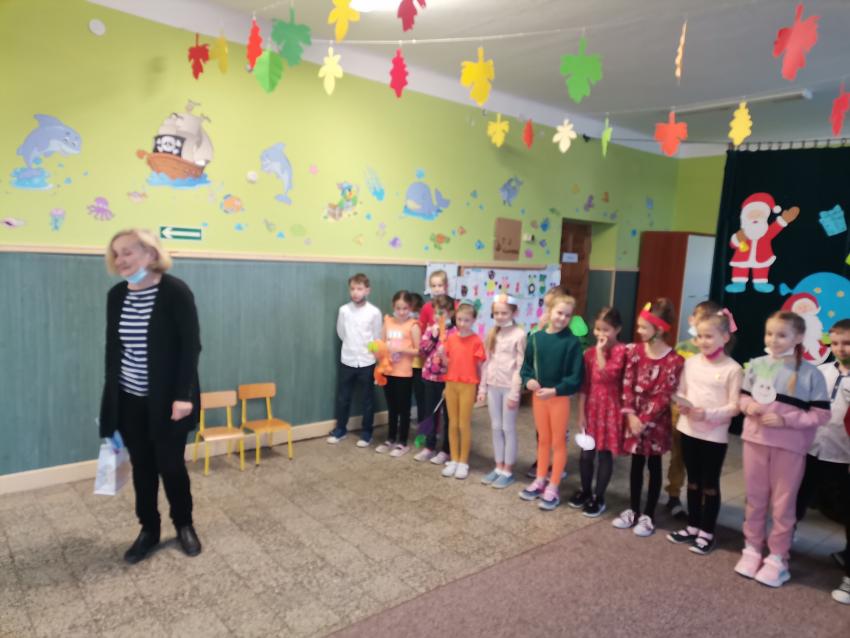 2 grudnia dzieci z grupy II odwiedzili uczniowie klasy II A ze Szkoły Podstawowej w Tarnogrodzie wraz z wychowawczynią Panią Teresą Pszczołą . Celem wizyty było popularyzowanie zdrowego sposobu odżywiania się. Uczniowie klasy II pięknie zaprezentowali inscenizację na temat owoców i warzyw. Przedszkolaczki wraz z Panią Anią i Panią Małgosią z zainteresowaniem obejrzały program artystyczny. Na zakończenie przedszkolaczki otrzymały słodki upominek od starszych kolegów. Serdecznie dziękujemy Pani Teresie Pszczole za wizytę i zapraszamy ponownie. /A.S./