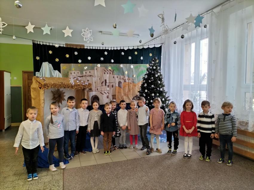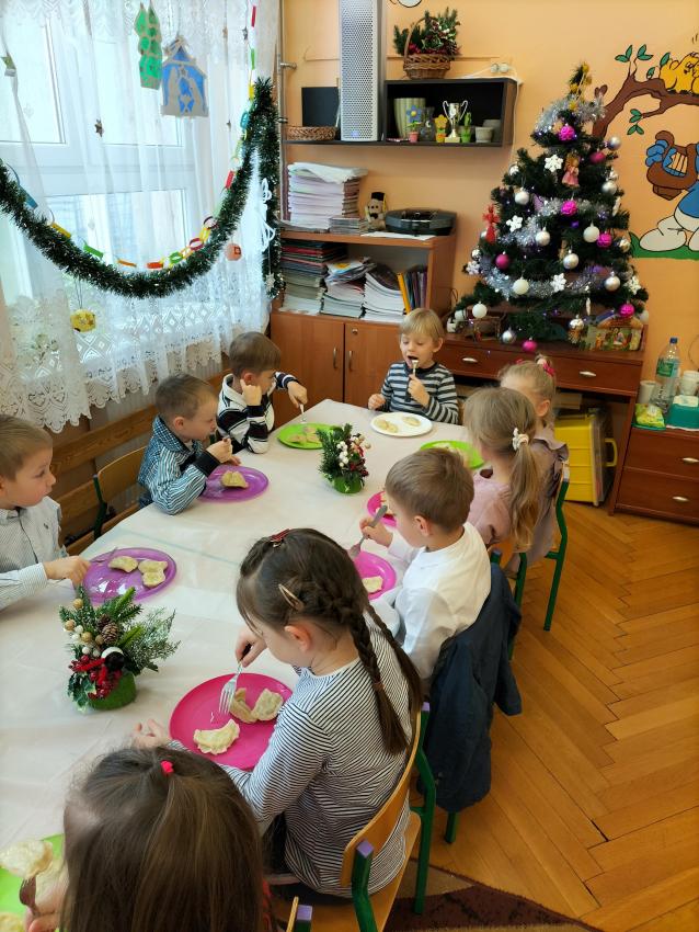 Przedświąteczny czas dla przedszkolaków z grupy V był bardzo intensywny; dzieci ubrały choinkę, dekorowały naszą salę, wcześniej własnoręcznie robionymi ozdobami, uczyły się pastorałki i utrwalały znane już kolędy, poznawały symbole i zwyczaje bożonarodzeniowe. Kiedy nadszedł ostatni dzień przed świętami nasza grupa obejrzała jasełka w wykonaniu dzieci z grupy VI a potem spotkała się z Panią dyrektor żeby złożyć sobie życzenia i wspólnie zasiąść do wigilijnego stołu na którym nie zabrakło czerwonego barszczu z uszkami i pierogów. /M.O./