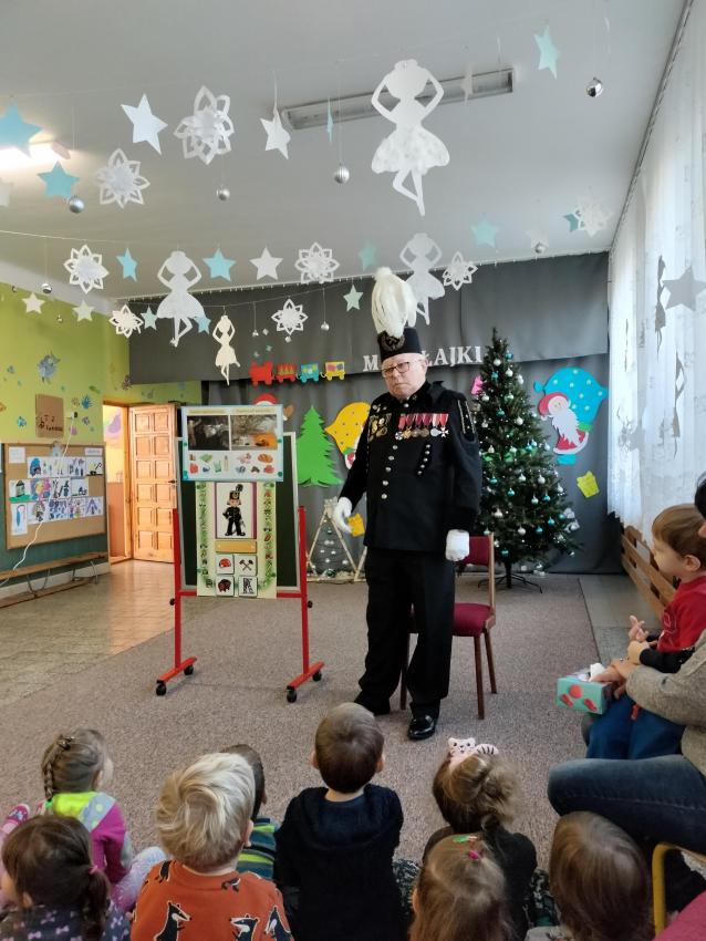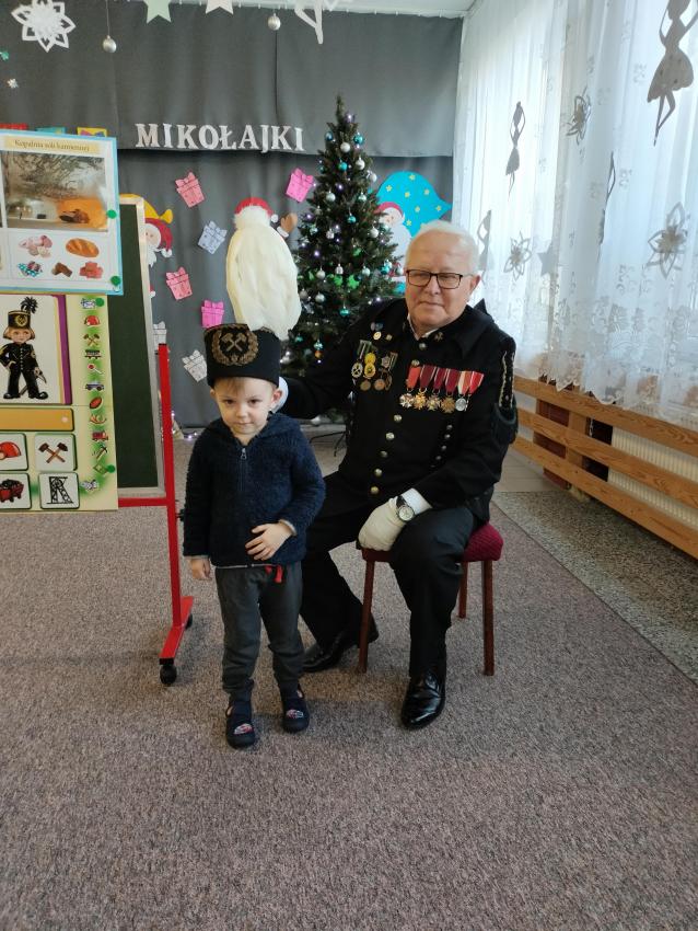 Dnia 08.XII.2022 r. z okazji dnia Górnika, które obchodzone jest 4 grudnia, nasze przedszkole odwiedził Niezwykły Gość, pan Władysław Chodkiewicz-emerytowany górnik. Dzieci zobaczyły z bliska, jak wygląda galowy mundur górnika. Dowiedziały sięrównież,że czapka górnicza nazywa się czako i posiada rózne kolory pióropusza, w zależności od pełnionej funkcji w kopalni.Przy tej okazji miały możliwość przymierzenia czako. Przedszkolaki zadawały wiele ciekawych pytań, na które Gość chętnie i wyczerpująco odpowiadał. Były zdjęcia indywidualne oraz grupowe. Pan Władysław Chodkiewicz został zaproszony na kolejne spotkanie. Obiecał, że odwiedzi placówkę za rok z okazji "Barbórki". Zaproponował, aby na tę okazję społeczność przedszkola nauczyła się i zaśpiewała dwie piosenki górnicze - "Walczyk górniczy" oraz "Starzyk", których teksty słów przekazał gronu pedagogicznemu. To było bardzo ciekawe spotkanie, podczas którego przedszkolaki pogłębiły swoją wiedzę na temat pracy górnika. /V.Ł./