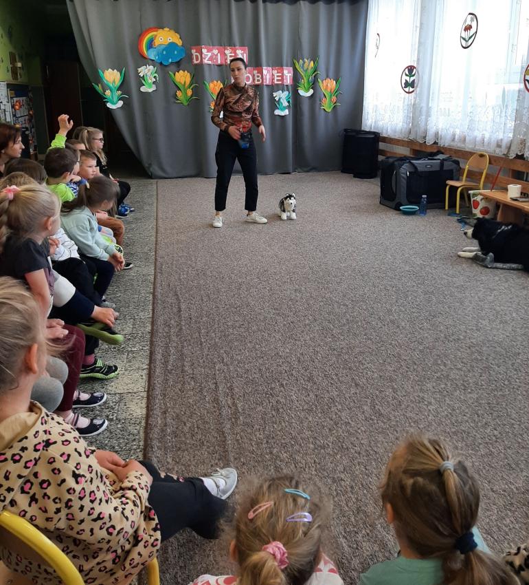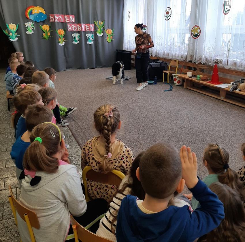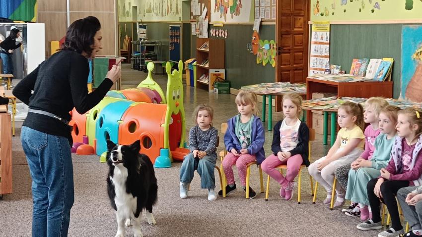 W dniach 11 i 13 03.25r. nasze przedszkole odwiedziła p.Agnieszka Tomaszewska. Pani Agnieszka jest trenerką psów, behawiorystką, oraz dogoterapeutką. Dzieci, które uczestniczyły w spotkaniach z uwagą obserwowały przedstawicielkę rasy Border collie i żywo reagowały na popisy psa terapeuty. Śmiechom i zachwytom nie było końca. "Prada"- terapeutka skradł serca najmłodszych od pierwszej chwili. Przedszkolaki poznały zasady prawidłowego i bezpiecznego postępowania z psami, przećwiczyły również pozycję ochronną w razie ataku. Dowiedziały się jak pielęgnować i dbać o żywe stworzenie. Bardzo serdecznie dziękujemy p.Agnieszce Tomaszewskiej za przeprowadzenie warsztatów i poświęcony nam czas.