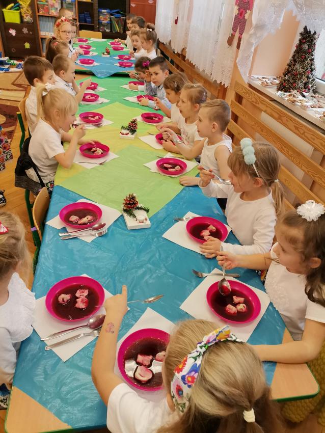 W poniedziałek 21 grudnia odbyła się w naszej grupie Wigilia. Święta Bożego Narodzenia kryją w sobie niepowtarzalną magię: radość i niecierpliwe oczekiwanie na pierwszą wigilijną gwiazdkę. Dla wielu jest to czas spotkań w rodzinnym gronie, dzielenia się opłatkiem, składania życzeń najbliższym oraz czas wspólnego kolędowania. Także u nas nastał cudowny dla wszystkich czas – Boże Narodzenie. Wspaniałym momentem było wspólne dzielenie się opłatkiem i składanie świątecznych życzeń, a także czas wspólnego posiłku, na który składały się tradycyjne wigilijne potrawy. Dzieci smakowały barszczyk z uszkami oraz pierogi. Na stole nakrytym obrusem nie zabrakło także słodkich pierników udekorowanych przez dzieci. Takie podniosłe chwile nie tylko utrwalają dzieciom znajomość tradycji i zwyczajów świątecznych lecz również, co najważniejsze, wzmacniają bliskie i serdeczne relacje. /A.S./